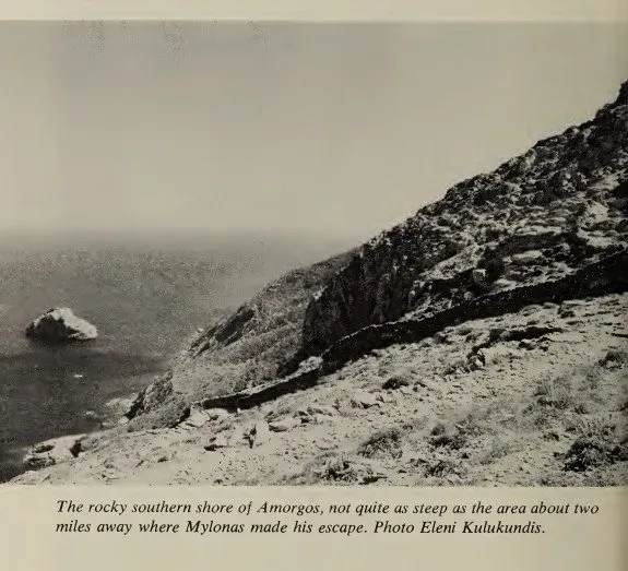 Cerca del pueblo de Hora, donde vivía, la costa sur de Amorgos es una roca escarpada, casi sólida, que cae más de 300 metros hasta el mar. Desde un punto en la cima de este acantilado, a unos tres kilómetros del pueblo, se puede ver una pequeña cala —casi la única hendidura en la impenetrable costa— donde posiblemente se podría atracar una lancha. Tardé unos 45 minutos en llegar al acantilado, donde otro sendero descendía hasta el mar. Nunca me atreví a intentarlo por miedo a levantar sospechas, pero calculé que tardaría al menos media hora en bajar. Si salía a dar un paseo justo después de registrarme a las 6, como hacía todas las tardes de verano, podría llegar a la orilla aproximadamente a las 7:15. Aproximadamente a la misma hora, un yate a motor sin luces podría acercarse al amparo de la oscuridad y arriar un bote.